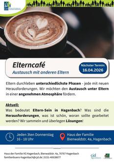 Am Donnerstag, dem 16. April 2026 findet wieder unser Elterncafé statt. Dieses Mal wollen wir uns über das Elternsein in Hagenbach unterhalten. Was ist hier toll, was weniger und wie finden andere Eltern Lösungen? Gibt es vielleicht etwas, was wir gemeinsam anregen können? 16.04.2026 von 16:00 Uhr – 18:00 Uhr im Haus der Familie.