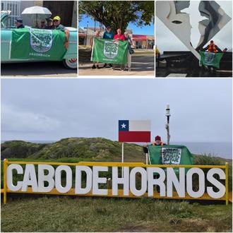 Die Hagenbachfahne ist weiterhin rund um den Globus unterwegs – und zeigt einmal mehr, wie eng die Verbundenheit zur Heimat auch in der Ferne ist. Eine besonders große Reise führte Vera und Roland Hecht gemeinsam mit Nora und Helmut Ott durch Mittelamerika. Von Cozumel in Mexiko bis nach Cartagena in Kolumbien war die Hagenbachfahne ständiger Begleiter. Leider wurde die Reise von einem Unfall überschattet: Helmut Ott verletzte sich am letzten Urlaubstag schwer und befindet sich derzeit noch in Behandlung. Wir wünschen ihm an dieser Stelle eine schnelle und vollständige Genesung. Auch am anderen Ende der Welt wurde die Fahne stolz präsentiert: Rolf Herrmann flog nach Buenos Aires, dann ging es weiter nach Patagonien und dann mit dem Schiff in Richtung Cabo de Hornos in Chile, dem sagenumwobenen Kap Hoorn, den südlichsten Punkt Südamerikas.