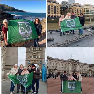 Etwas näher, aber nicht weniger eindrucksvoll, zog es Ulrike Eisenlohr und Ute Kaufmann zum Wandern nach Mallorca. Rund um Cala Radjada war die Hagenbachfahne ebenfalls mit auf Tour und sorgte für ein Stück Heimatgefühl unter südlicher Sonne. Ein ganz besonderes Erlebnis durfte das Ehepaar Renate und Jürgen Kahrau erleben: Anlässlich ihrer Goldenen Hochzeit reisten sie gemeinsam mit ihrer Familie nach London. Die Kinder hatten diese besondere Überraschung organisiert – natürlich durfte auch die Hagenbachfahne nicht fehlen. Ob vor dem Buckingham Palast, auf der Tower Bridge oder an der Themse – Hagenbach war immer mit dabei.