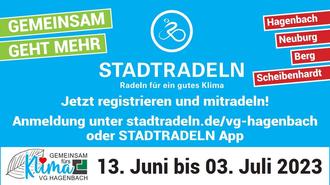 Von Dienstag, dem 13. Juni 2023 bis Montag, dem 03. Juli 2023 findet das diesjährige STADTRADELN – „Verbandsgemeinderadeln“ wieder statt. Der gesamte Landkreis Germersheim beteiligt sich und die Verbandsgemeinde Hagenbach ist mit ihren Gemeinden Berg, Hagenbach, Neuburg und Scheibenhardt ebenfalls wieder mit dabei.