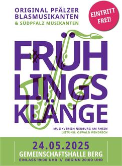 Am Samstag, dem 24. Mai 2025, lädt der Musikverein Neuburg am Rhein unter seinem bekannten Namen „Original Pfälzer Blasmusikanten“ und unter der Leitung von Oswald Windrich zu einem festlichen Frühjahrskonzert unter dem Motto „Frühlingsklänge“ ein. Gleichzeitig wird an diesem Abend zum ersten Mal die neue musikalische Kooperation mit den Musikvereinen aus Hagenbach und Berg (Pfalz) vorgestellt – unter dem gemeinsamen Namen „Südpfalz Musikanten“.