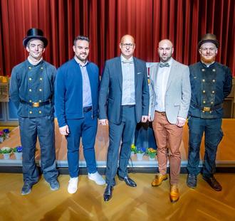 Der Stadtbürgermeister und die Beigeordneten mit den Schornsteinfegern Fabian Vollmer (links) und Christopher Nether (rechts). Sie begrüßten am Einlass die Gäste und überreichten Glückskäfer.