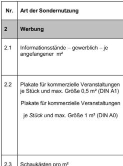 | 1. | an den Stätten der Leistung befindliche Werbeanlagen, Schilder, Hinweisschilder und -zeichen, Warenautomaten und sonstigen Verkaufseinrichtungen, die innerhalb einer Höhe von 4,00 m nicht mehr als 40 cm in den Straßenraum/Gehweg hineinragen sowie bis zu 3 Plakatständer/Hinweisschilder mit einer max. Größe von bis zu jeweils 0,99 m², die sich auf dem Gehweg befinden und diesen in einer Breite von mindestens 1,50 m freilassen; |