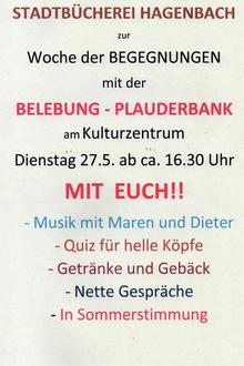 Unkompliziert, gesellig, heiter, bequem, dazu laden die Plauderbänke in Hagenbach ein. Wer am Dienstag, dem 27. Mai 2025 zur Plauderbank vor das Kulturzentrum kommt, wird es erleben: Begegnungen bereichern unseren Alltag, unser Leben.