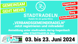 Am kommenden Montag beginnt das STADTRADELN in unserer Verbandsgemeinde. Alle Bürgerinnen und Bürger sind herzlich eingeladen in der Zeit vom 03.06.2024 bis 23.06.2024 bei der Radel-Aktion für die Gemeinschaft, die Gesundheit und natürlich das Klima teilzunehmen.