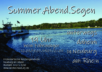 Wenn Gott nicht da ist, wo wir sind, wo ist er dann? Deshalb gehen wir dieses Jahr mit einer Reihe von „Minigottesdiensten“ dorthin, wo nicht nur die Neuburgerinnen und Neuburger gerne sind: An den Rhein, 12., 17., 19. oder 21. Juli 2023 um 19:00 Uhr an den Fähranleger.