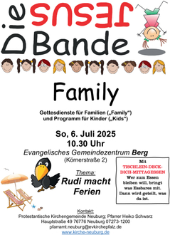 | 10:30 Uhr | Familiengottesdienst mit Pfr. Schwarz, dem Raben Rudi und anschließendem „Tischlein-deck-dich-Mittagessen“. |