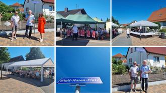 Der Gemeinderat hat durch den Aufbau von Zelten des Obst- und Gartenbauvereins Scheibenhardt dafür gesorgt, dass alle einen Schattenplatz ergattern konnten. Vielen Dank an den OGV für die Überlassung und an Gemeinderat für den Auf- und Abbau. Mit stimmungsvoller Musik, unter der Leitung von Dirigent Uli Kreger, hat der Musikverein Scheibenhardt seinen Teil zum Gelingen der Einweihung beigetragen. Herzlichen Dank an den Musikverein Scheibenhardt. Die Gäste wurden durch die „Bienwaldfüchse“ des Obst- und Gartenbauvereins hervorragend bewirtet. Bevor das Straßenschild durch den noch amtierenden Ortsbürgermeister Edwin Diesel und dessen Nachfolger Thomas Ehl enthüllt wurde, erläuterte der scheidende Ortsbürgermeister in einer kurzen Rede noch einmal, wie es zu dem Namen für den Platz gekommen ist.