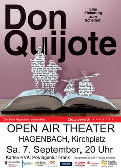 Die Stadt Hagenbach präsentiert am Samstag, dem 7. September 2024 um 20:00 Uhr ein besonderes Kultur-Highlight. In Kooperation mit dem Chawwerusch Theater Herxheim veranstalten wir auf dem Kirchplatz das Open-Air-Theater „Don Quijote – Eine Einladung zum Scheitern“. Karten sind in der Postagentur Frank und online bei www.pfalzshow.de erhältlich. Preise: 22 Euro, ermäßigt 18 Euro für Rentner und Jugendliche bis 18 Jahre. Der örtliche Verein „Hagenbacher Wölfe“ bewirtet das Event ab 18:30 Uhr mit einer Auswahl an Getränken und Snacks. Bei schlechter Wetterprognose findet das Theater im Kulturzentrum statt.