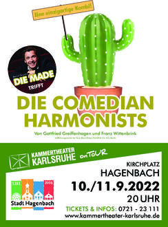 Tolle Resonanz für das große Open-Air-Musicalwochenende vom Freitag, dem 09. September 2022 bis Sonntag, dem 11. September 2022. Die Vorstellung „Showtime“ am Freitagabend ist bereits restlos ausverkauft. Aufgrund terminlicher Überschneidungen eines Darstellers/Sängers gibt es für die Vorstellungen am Samstag und Sonntag eine kleine Änderung im Programm. Das Stück für die beiden Tage nennt sich nun „Die Made trifft die Comedian Harmonists“. Hier treffen zwei Klassiker des Kammertheaters aufeinander, der legendäre Heinz Erhardt-Abend und das musikalische Schauspiel „Comedian Harmonists“. Bernd Gnann führt durch die einzigartige Veranstaltung. Gedichte von Heinz Erhardt werden kombiniert mit Musik aus „Comedian Harmonists“ - gute Unterhaltung ist vorprogrammiert. Bernd Gnann, Geschäftsführer des Kammertheaters, teilt uns mit: „Wir haben die kombinierte Aufführung schon einige Male mit großem Zuspruch und Erfolg gespielt. Sie hören alle Harmonists Lieder, garniert mit Comedy und Gedichten. Es wird lustiger als das vorgesehene Programm. Wir hoffen, dies ist in Ihrem Sinne.“ Alle Karten behalten ihre Gültigkeit und sind weiterhin auf www.kammertheater-karlsruhe.de, sowie freitags und montags von 17:00 Uhr - 18:00 Uhr im Alten Rathaus bei Marijana David zu erwerben.