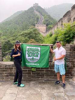 Romy und Marc Kehm waren auf einer kulturellen Rundreise durch China. Die Hagenbacher Fahne wurde an der chinesischen Mauer präsentiert.