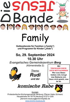 | 10:30 Uhr | Familiengottesdienst mit Rudi, Team und Pfr. Schwarz |