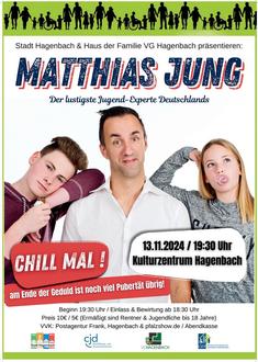 Wer hat Teenager in der Pubertät? Wer war selbst mal Teenager in der Pubertät? Und wer ist der Meinung, dass sich der Mann immer noch in der Pubertät befindet? Der ist richtig im neuen Programm von Matthias Jung – Deutschlands lustigstem Jugendexperten und Spiegel- Bestseller-Autor von „Chill mal – am Ende der Geduld ist noch viel Pubertät übrig!“ Wer Kinder in der Pubertät hat, der kennt die hitzigen Diskussionen über Schule, unaufgeräumte Zimmer und Helfen im Haushalt. Der weiß auch, WhatsApp ist überlebenswichtig und Hygiene oft überschätzt. Jedenfalls aus der Sicht der Teenager. Unsere Kinder leben laut und wir haben oft nicht die leiseste Ahnung, wie sie so ticken. Auf einmal sind wir peinlich, gemein und einfach nur nervig. Das gehört zum Abnabelungsprozess dazu. Matthias weiß: Als Eltern muss man lernen loszulassen. Am liebsten die Kreditkarte. Also keine Sorge: Diplom Pädagoge, Autor und Pubertätsexperte Matthias Jung kommt mit seinem Programm den Erwachsenen und Eltern zur Hilfe. Er liefert Antworten auf Fragen, die Eltern bewegen. Eine einzigartige Mischung aus Sachverstand und Humor, faktenreich und äußerst unterhaltsam. Der lustigste Gedulds-Leidfaden: Nah am Alltag. Nah an den Eltern. Nah am Abenteuer Pubertät.