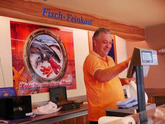 Immer gut gelaunt. Marktbeschicker Roland Sturm steht mit seinen Fischspezialitäten neben dem Alten Rathaus und informiert gerne über seine frische Ware.