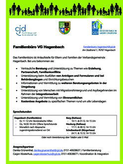 Danika Grünenthal 0151/40638637 & Casjen Klosterhuis 0151/40638677 oder familienbuero-hagenbach@cjd.de, Familienbüro, Am Stadtrand 1, 76767 Hagenbach.