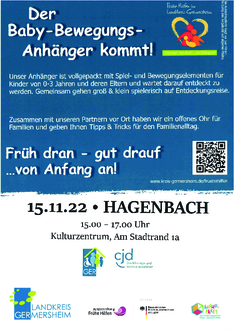Ein Anhänger vollgepackt mit Spiel- und Bewegungselementen für Kinder von 0-3 Jahren und ihre Eltern. Gemeinsam geht es auf Entdeckungsreise und nebenbei stehen wir für Tipps und Tricks rund um den Familienalltag zur Verfügung. Termin: Dienstag, 15.11.2022 von 15:00 Uhr - 17:00 Uhr im Kulturzentrum Hagenbach.