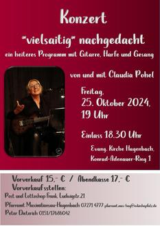 | Auferstehungskirche: Claudia Pohel mit dem Programm: „vielsaitig nachgedacht“. Ein heiteres Programm mit Gitarre, Harfe und Gesang | |