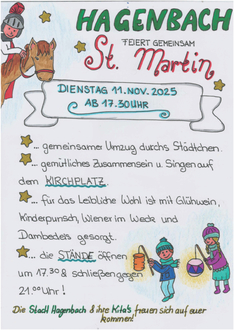Die Stadt Hagenbach veranstaltet am Dienstag, dem 11. November 2025 um 17:30 Uhr in Kooperation mit den Kitas Regenbogen, Kinderland und St. Michael wieder einen großen gemeinsamen Laternenumzug an St. Martin. Start ist am Kirchplatz. Sehr schön wäre es, wenn die Anwohner entlang der Umzugsstrecke (Ludwigstr./Schloßgärtenstr.) für ein passendes Ambiente in den Fenstern, Vorgärten oder Höfen sorgen. Wer sich bereit erklären würde in seinem Hof das St. Martinslied z.B. vom Tonband abzuspielen, darf sich gerne mit Tobias Zimmermann oder mit den Kita-Leiterinnen in Verbindung setzen. Das gemeinsame Singen soll dieses Jahr im Vordergrund stehen. Wir würden uns freuen, wenn einige erprobte Sängerinnen und Sänger teilnehmen und alle, Groß und Klein, Jung und Alt, mitmachen. Die Jugendfeuerwehr begleitet die Veranstaltung mit einem Fackelzug. Die Kitas bewirten ein gemütliches Zusammensein mit Glühwein, Punsch, heißen Wienerle und Dambedei. Die Bevölkerung ist herzlich eingeladen an der großen St. Martinsfeier teilzunehmen.