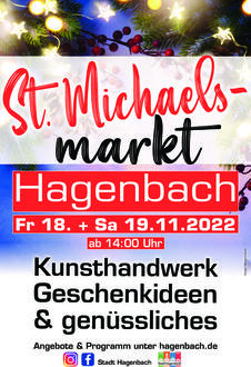 Beim St. Michaelsmarkt am 18. und 19. November 2022, Freitag und Samstag jeweils ab 14:00 Uhr, erwarten uns folgende Programmpunkte: Alphörner und Weisenbläser, Kinderzauberer, Lichtertanz der Tanzschule Danzante und Vorlesegeschichten. Außerdem haben sich ein Weihnachtswichtel und Olaf, der berühmteste Schneemann der Welt, ebenfalls angekündigt. Besonders erfreulich ist, dass neun örtliche Vereine oder Gruppen für unser leibliches Wohl sorgen. Die Hagenbacher Wölfe servieren Flammkuchen, der Gesangverein Frohsinn lockt mit Saumagenburgern. Der Obst- und Gartenbauverein hat die beliebten Kartoffelpuffer im Angebot. Der Verein für Volksmusik und Brauchtum bietet zusammen mit dem Pfälzerwald-Verein Bratwürste und Steaks an. Die Haibuchenschule backt Waffeln und die Scooters grillen ebenfalls Bratwürste. Das Chorwerk bietet Gulasch- oder Kartoffelsuppe. Natürlich darf der Glühwein und Kinderpunsch nicht fehlen. Mehrere Stände, unter anderem die FCK-Freunde, sorgen hier für eine große Auswahl. Heißer Caipirinha, ein Wolfsshot und Wintergin runden das Angebot ab. In der kommenden Ausgabe stellen wir Ihnen einen Auszug der Geschenk- und Dekoideen, oft liebevoll in Handarbeit hergestellt, vor.