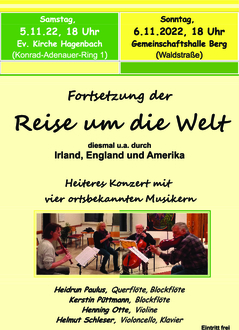 Nach dem großartigen Erfolg im vergangen Jahr planen dieselben vier ortsbekannten Musiker Heidrun Paulus, Kerstin Püttmann, Henning Otte und Helmut Schleser eine Fortsetzung ihrer musikalischen Reise um die Welt. Am Samstag, dem 5. November 2022 in der Ev. Kirche Hagenbach und am Sonntag, dem 6. November 2022 in der Gemeinschaftshalle Berg soll sie jeweils um 18:00 Uhr starten. Diesmal führt die Reise u.a. nach Irland, England, Italien und Österreich, aber natürlich wird es auch wieder die eine oder andere Stippvisite in Amerika geben. Auch Musik aus Deutschland wird erklingen. Man kann also sehr gespannt sein, was das Quartett diesmal auf die Beine stellen wird. Und wer den Abend in Berg anschließend in gemütlicher Runde ausklingen lassen möchte, kann dies gerne noch bei einem Gläschen Glühwein tun. Termine: Samstag, dem 5. November 2022, 18:00 Uhr, Ev. Kirche Hagenbach, Konrad-Adenauer-Ring 1 und Sonntag, dem 06. November 2022, 18:00 Uhr, Gemeinschaftshalle Berg, Waldstraße. Reiseroute: England, USA, Deutschland, Irland, Österreich, Italien, USA.