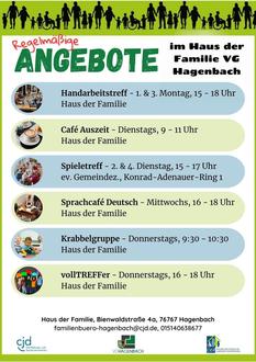 Casjen Klosterhuis, Tel. 01514 / 0638677, Kaja Crocoll, Tel. 01514 / 0638637 oder familienbuero-hagenbach@cjd.de, Haus der Familie, Bienwaldstraße 4a, 76767 Hagenbach.