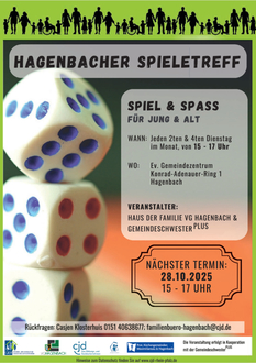 Wir spielen verschiedene Spiele, gerne auch Klassiker, in gemütlicher Runde bei Kaffee und Keksen. Jeden zweiten und vierten Dienstag im Monat, 15:00 Uhr - 17:00 Uhr im ev. Gemeindezentrum, Konrad-Adenauer-Ring 45, Hagenbach. Nächste Termine: 28.10.2025 & 11.11.2025.