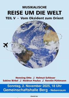 Die „Musikalische Reise um die Welt“ wird auch in diesem Jahr fortgesetzt, und zwar bereits in der 5. Auflage. Kreuz und quer geht es wieder, diesmal u.a. nach Griechenland, Japan und in den Orient, wo das Musikerensemble, dass sich inzwischen in die Herzen der Berger gespielt hat, unter der bewährten Leitung von Heidrun Paulus mit seiner erfrischenden Performance Station macht. Henning Otte, Sabine Birkel, Kerstin Püttmann, Helmut Schleser und Heidrun Paulus freuen sich, Ihre Begleiter bei dieser abwechslungsreichen musikalischen Weltreise sein zu dürfen. Das Konzert findet am Sonntag, dem 2. November 2025, 18:00 Uhr im Nebenraum der Gemeinschaftshalle Berg statt. Spenden sind willkommen. Und wer noch Lust hat, kann gerne bei Glühwein und anderen Getränken und guten Gesprächen den Abend ausklingen lassen. Wir freuen uns auf Ihr Kommen.