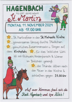 Die Stadt Hagenbach veranstaltet am Montag, dem 11. November 2024 in Kooperation mit den Kitas Regenbogen, Kinderland und St. Michael erstmals seit vielen Jahren wieder eine große gemeinsame St. Martinsfeier mit Laternenumzug. Nach dem Gottesdienst um 17:00 Uhr in der Kirche St. Michael laufen wir gemeinsam hinter St. Martin auf dem Pferd eine kleine Runde durch das Stadtgebiet. Wir würden uns freuen, wenn die Anwohner entlang der Umzugsstrecke (Ludwigstr./Schloßgärtenstr.) für ein passendes Ambiente in den Fenstern, Vorgärten und Höfen sorgen. Zum Abschluss singen wir um ca. 18:30 Uhr gemeinsam das Martinslied auf dem Kirchplatz. Die Jugendfeuerwehr begleitet die Veranstaltung mit einem Fackelzug. Die Kitas bewirten ein gemütliches Zusammensein mit Glühwein, Punsch, heißen Wienerle und Dambedei. Die Bevölkerung ist herzlich eingeladen an der großen St. Martinsfeier teilzunehmen. Die Feier und die Bewirtung enden spätestens um 21:00 Uhr.