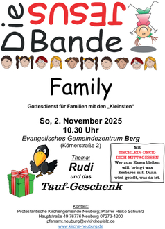 Familiengottesdienst mit Pfr. Schwarz; Thema. Rudi und das Taufgeschenk. In dem Gottesdienst werden getauft, Silas und Elias Hollinger, Söhne von Jan Hollinger und Mareike Hollinger, geb. Baumgärtner.