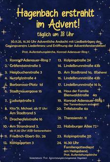 | 16:30 Uhr | Adventsandacht zur Eröffnung der diesjährigen Adventsfenster-Aktion. Der Gesangsverein Liederkranz wird mit adventlichen Liedern auf die Vorweihnachtszeit einstimmen. (Pfarrerin A. Guttzeit mit Konfis 2026) |