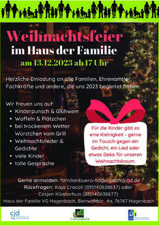 Casjen Klosterhuis, Tel. 0151 / 40638677, Kaja Crocoll, Tel. 0151 / 40638637 oder familienbuero-hagenbach@cjd.de, Haus der Familie, Bienwaldstraße 4a, 76767 Hagenbach.