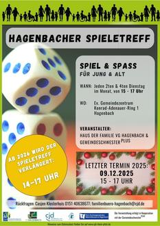 Wir spielen verschiedene Spiele, gerne auch Klassiker, in gemütlicher Runde bei Kaffee und Keksen. Jeden zweiten und vierten Dienstag im Monat, 15:00 Uhr – 17:00 Uhr im ev. Gemeindezentrum, Konrad-Adenauer-Ring 45, Hagenbach. Nächster Termin: 09.12.2025.