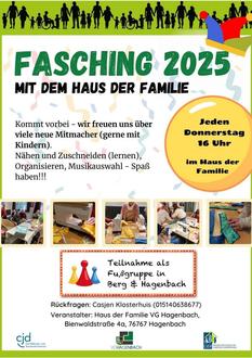 Wir vom Haus der Familie werden als eigene Gruppe bei den Umzügen in Berg und Hagenbach mitziehen. Wir freuen uns über neue Gesichter und treffen uns jeden Donnerstag um 16:00 Uhr im Haus der Familie.