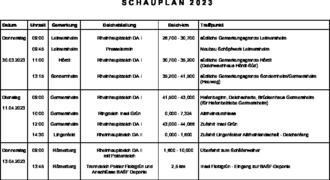 Die Struktur- und Genehmigungsdirektion Süd, Deichmeisterei/Neubaugruppe Hochwasserschutz Speyer führt vom 21.03.2023 bis 13.04.2023 die Schau des Rheinhauptdeiches zwischen Berg/Pfalz und Römerberg durch. Der Schauplan ist auf der Internetseite der SGD Süd unter dem Link: https://sgdsued.rlp.de/de/service/oeffentlichkeitsbeteiligung-bekanntmachungen veröffentlicht. Den Anliegern, Eigentümern und Nutzungsberechtigten und den nach § 63 des Bundes-Naturschutzgesetzes anerkannten Verbänden wird gemäß § 101 Abs. 2 Landeswassergesetz Gelegenheit zur Teilnahme an der Deichschau gegeben. Des Weiteren werden die Anlieger, Eigentümer und Nutzungsberechtigten aufgefordert, das Betreten ihrer Grundstücke gemäß § 101 Wasserhaushaltsgesetz zu ermöglichen.