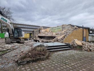 Die Pausenhofüberdachung inklusive der WC-Anlagen sowie die Mensa und die Mehrzweckhalle sind bereits komplett abgebrochen. Aktuell sind lediglich noch Bruchstücke des ehemaligen Schulschwimmbads erkennbar. Zuletzt wird die Fahrradhalle abgebrochen. Danach kann mit den Rohbauarbeiten für das neue Schulgebäude begonnen werden, welche den bestehenden Pavillonbau und das Grundschulhauptgebäude zukünftig verbinden wird.