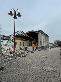 Nachdem bis Anfang Januar die Entkernung im Inneren der Mehrzweckhalle sowie der WC- und Kelleranlagen stattgefunden hat, erfolgt nunmehr seit dem 10.01.2024 der eigentliche Abbruch von Dächern, Wänden, Decken und der Kelleranlagen – deutlich für jedermann sichtbar.