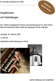 Am Sonntag, dem 16. Februar 2025 findet um 17:00 Uhr ein Orgelkonzert mit Violinenklängen in der Katholischen Kirche in Neuburg statt. Der renommierte Pianist und Konzertorganist Dr. Boris Feiner wird unterstützt von einer Violine, die historische Neuburger Orgel erklingen lassen. An alle Interessierten ergeht herzliche Einladung. Der Eintritt ist frei, um Spenden wird gebeten. Aufgrund der Jahreszeit ist es in der Kirche recht kühl, weshalb warme Kleidung empfohlen wird.