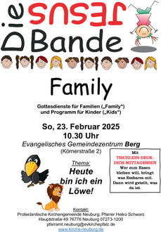 Herzliche Einladung zum ersten Familiengottesdienst in diesem Jahr am Sonntag, dem 23. Februar um 10:30 Uhr im Ev. Gemeindezentrum Berg. Danach gibt es für alle, die Lust und Zeit haben, ein „Tischlein deck dich Mittagessen“. Und das geht so: Wer zum Essen bleiben möchte, bringt etwas Essbares mit. Nach dem Gottesdienst stellen wir Stühle und Tische zusammen und das Essen drauf. Fertig ist die Vorbereitung.