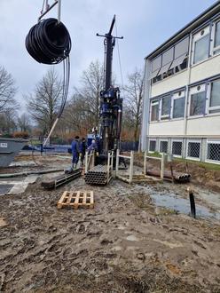 Für die Einrichtung der Sole-Wasserwärmepumpe werden nach Berechnung des erforderlichen Energiebedarfs zur Deckung der Heizlast der Grundschule voraussichtlich 18 Geothermiebohrungen mit einer Tiefe von 126 m erforderlich. Am 05.02.2025 fand hierzu die erste Bohrung statt.