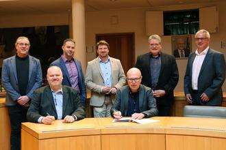 Vorne (l. nach r.): Thorsten Weimann (Vulcan Energie), Dr. Dominik Geißler (Oberbürgermeister Stadt Landau) Hinten (l. nach r.): Jörg Zeilinger (Vulcan Energie), Thomas Kienzler (Ortsbürgermeister Rohrbach), Sven Koch (Ortsbürgermeister Herxheim), Martin Baumstark (Ortsbürgermeister Insheim), Christian Sommer (Bürgermeister Herxheim)