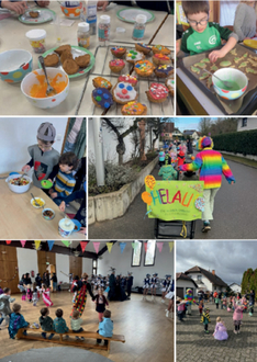 Ein weiteres Highlight war der traditionelle KRACHMACHERUMZUG am schmutzigen Donnerstag. Mit lauter Musik und Instrumenten zogen die kleinen Strolche durch das Dorf und verbreiteten faschingshafte Stimmung. Eltern und Nachbarn standen am Straßenrand, bereit mitzufeiern und mitzutanzen, sodass es ein ausgelassenes Fest für Groß und Klein wurde.