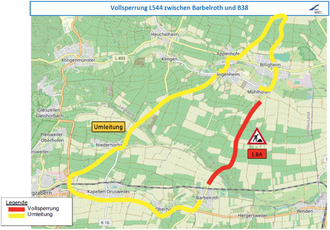 Die Umleitung während der Sanierungsarbeiten im ersten Bauabschnitt erfolgt aus Richtung Barbelroth über die Landesstraße L427, die Bundesstraße 38 und L544.