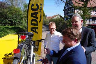 Ortsbürgermeister Sven Koch (vorne), Thomas Gebhart, MdB, und Georg Kern (rechts), Erster Kreisbeigeordneter, "testen" die Radservicestation.