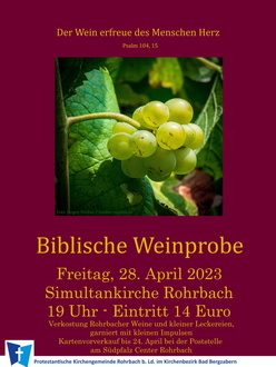 am Freitag, 28. April, um 19 Uhr in der Simultankirche Rohrbach mit Wein der Rohrbacher Winzer*innen und kleinen Leckereien - Kartenvorverkauf erfolgt über die Poststelle im Südpfalz Center bei Doris Hartmann. Herzliche Einladung!