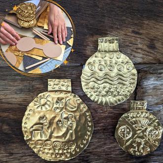Außerdem nehmen wir euch mit auf eine kleine Reise in die etwas spätere Bronzezeit: Im zweiten Workshop könnt ihr euch einen Goldblech-Anhänger herstellen: Dafür verwenden wir eine spezielle Goldfolie und ihr erlernt die sogenannte Punziertechnik, mittels derer ihr euren Anhänger mit eigenen Mustern oder Originalmustern aus der Vorgeschichte verzieren könnt.