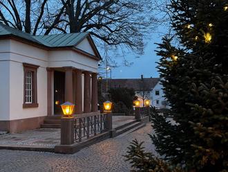Beleuchtung vor der Kriegergedächtniskapelle am frühen Abend.