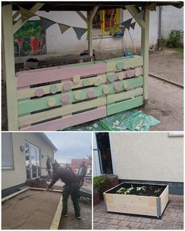 Am Nachmittag kamen einige Eltern sowie natürlich auch die Kinder zusammen, um gemeinsam anzupacken. Die Matschküche im Garten der Kita hat einen neuen farbenfrohen Anstrich bekommen. Außerdem wurde ein neues Hochbeet errichtet und dieses sowie weitere Hochbeete bepflanzt - von Tomaten über knackigen Salat bis hin zu verschiedenen Kräutern wird es hier bald grün und lecker! Beim Provisorium im Pfarrheim wurde zudem ein Sandkasten aufgebaut und befüllt, der vor allem von den Kindern der Leoparden-Gruppe, die dort untergebracht ist, bespielt werden darf. Während die Eltern arbeiteten, durften die Kinder im Garten der Kita spielen oder auch fleißig mithelfen, die Projekte umzusetzen. Ein Highlight für die Kinder war der Besuch des Eismannes, bei dem sich jedes Kind ein leckeres Eis aussuchen durfte. Die Stimmung war geprägt von einem tollen Austausch und der Zusammenarbeit zwischen den Eltern. Am Montag nach dem Handwerkertag haben alle Kinder die Ergebnisse bestaunt und waren von den Veränderungen in ihrer Kita begeistert.