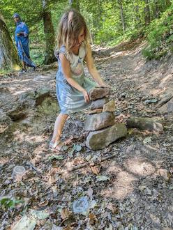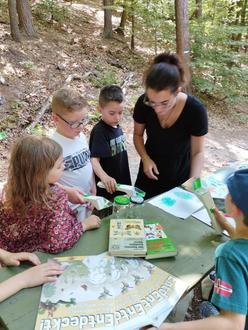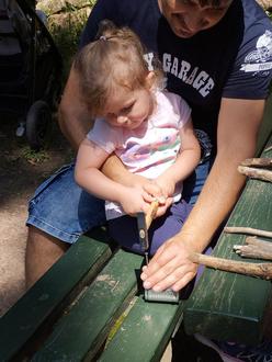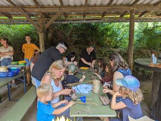Dort angekommen wartete für Kinder und deren Eltern ein abwechslungsreiches Angebot zum Basteln mit Naturmaterialien, Waldboule, Schnitzen, Naturmandala, Geräuschemacher, Wasserkreisel, Webrahmen und Insektenbeobachtungsstation.