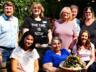 Die Jubilarin (Mitte vorne) wird von den Anwesenden zum Dienstjubiläum beglückwünscht.
