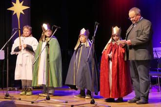 Pfarrer Arno Vogt mit Sternsingern.